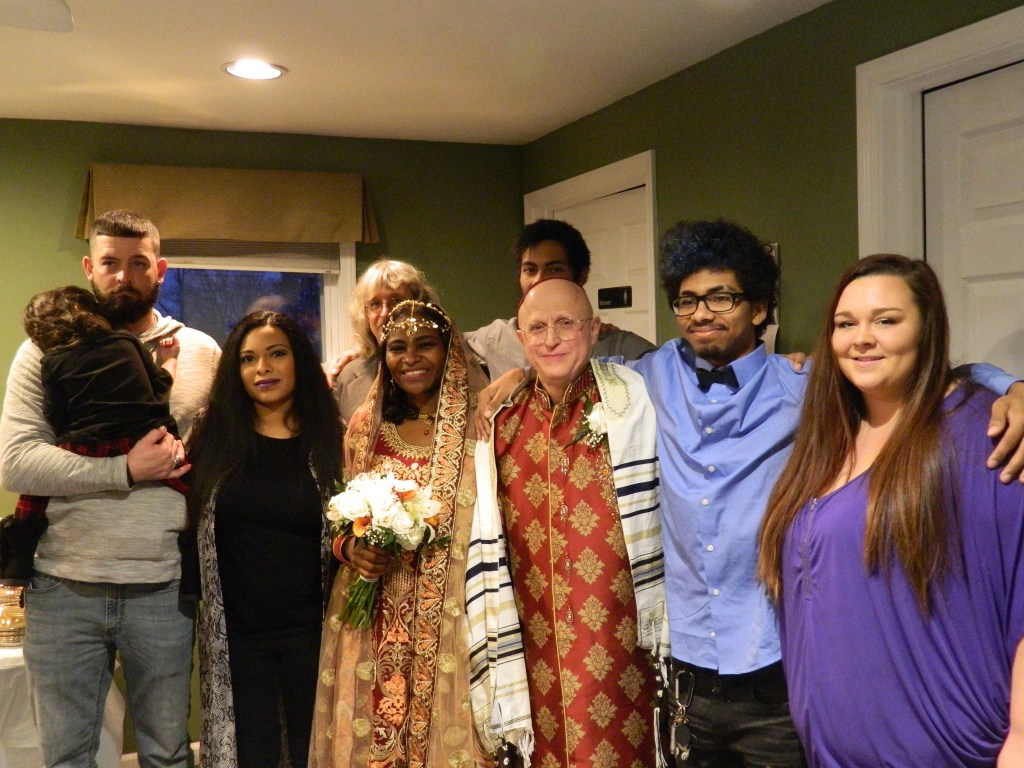 Our “elopement” turned into a lovely ceremony under the chuppah with family and friends celebrating with us. The groom and I both wore Indian outfits in gold, peach, and burgundy. We ordered samosas and various pakoras for our guests from Taste of India, our favorite Indian restaurant. The owner himself made the delivery. We drank a little wine and took cellphone pictures with our family and everyone present. We even had an impromptu photographer who was able to provide us with some almost professional-looking pics. Afterward, my new husband and I took our children and other family members to Taste of India for our wedding dinner.