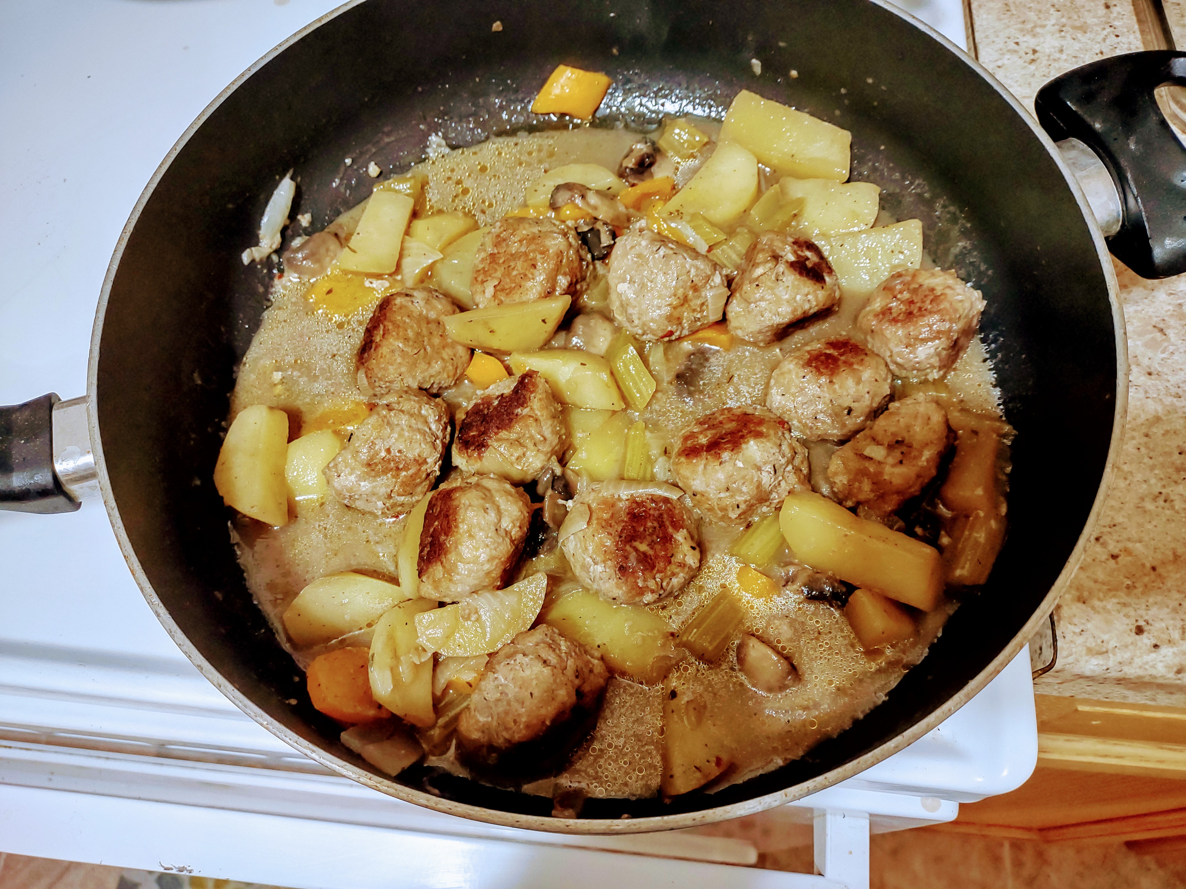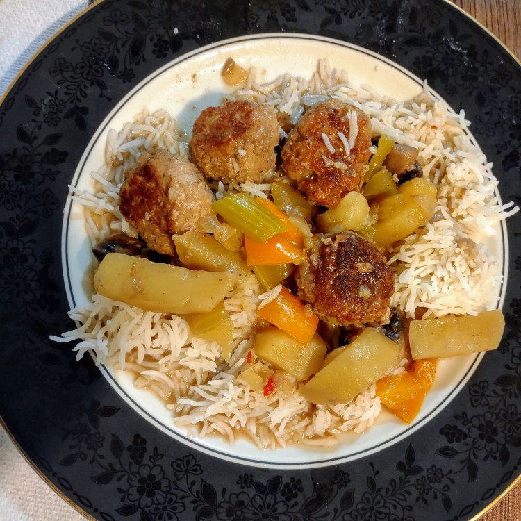 After frying, I added sliced potatoes, veggies, coconut milk, water, and spices to these Tuna “Meatballs” and simmered until the veggies were all cooked; then, I served them hot over a bed of rice. Yummy-Delicious!