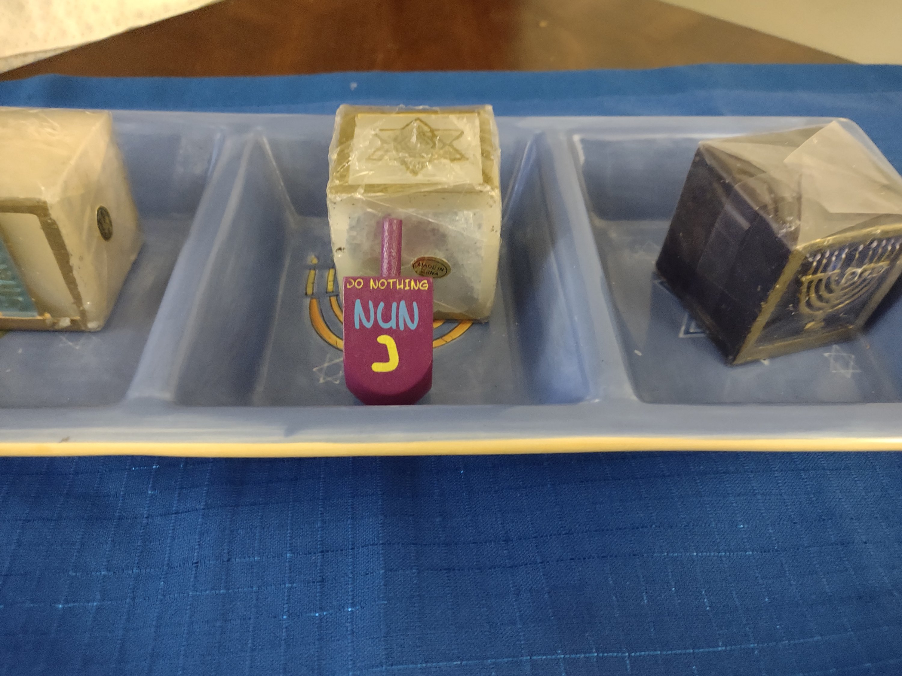 Each Dreidel is inscribed with four Hebrew letters on each side. The first is the letter נ Nun. The second letter is ג Gimel. The third letter is ה Heh. The fourth letter is ש Shin.